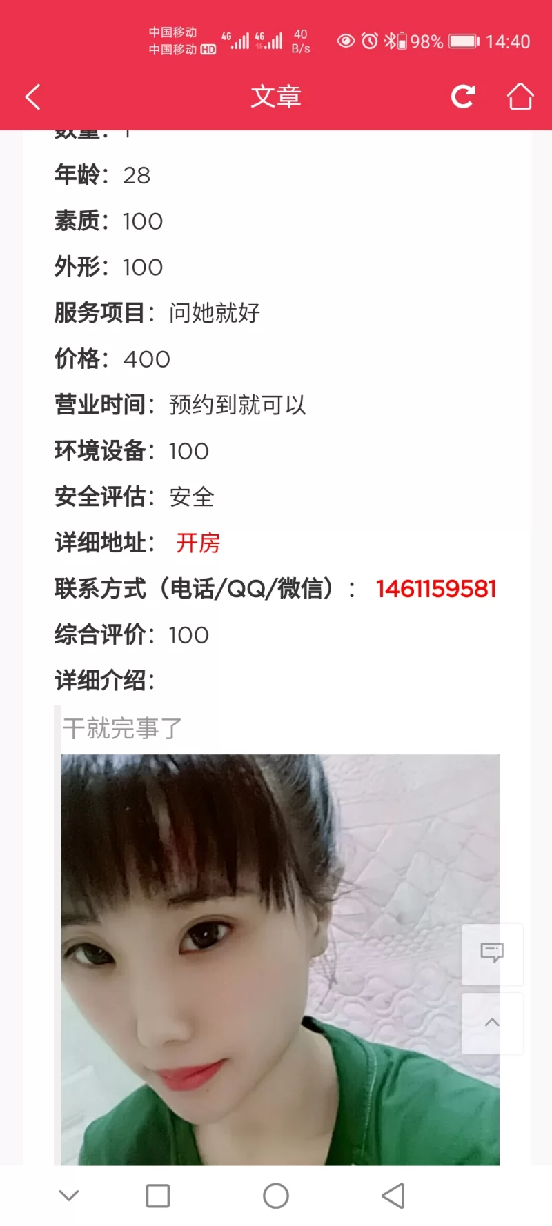 信息分类:骗子曝光 地区:山西省-吕梁 信息来源:亲自体验 年龄:26 颜值身材:50 服务项目:50 价格:400 环境设备:不好 详细地址: (管理提示:经用户举报,此信息有诈骗行为,请勿被骗!) 联系方式(QQ号): (管理提示:经用户举报,此信息有诈骗行为,请勿被骗!) 详细介绍: 假的 骗子曝光